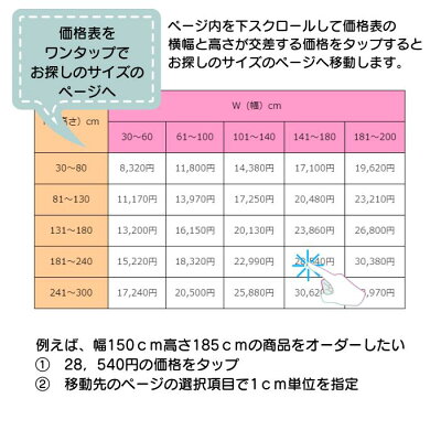 1.窓の測り方とご注文サイズの決め方につきまして→ 2.付属部品と取付につきまして→ 生地サンプルはこちら(デザイン&柄生地)→ 【価格表をクリックするとお探しのサイズのページへ移動します】【税別】 H(高さ)cm W(幅)cm 30〜60 61〜100 101〜140 141〜180 181〜200 30〜80 8,320円 11,800円 14,380円 17,100円 19,620円 81〜130 11,170円 13,970円 17,250円 20,480円 23,210円 131〜180 13,200円 16,150円 20,130円 23,860円 26,800円 181〜240 15,220円 18,320円 22,990円 28,540円 30,380円 241〜300 17,240円 20,500円 25,880円 30,620円 33,970円 ※カバーの仕様がPVCからアルミニウムカバーに変わりました。