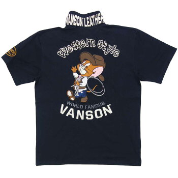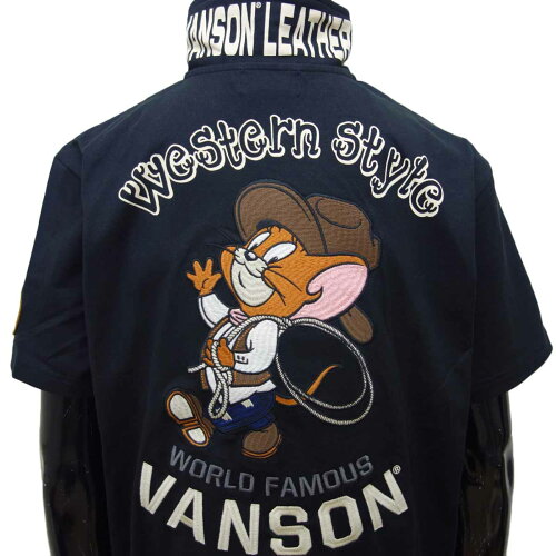 ブランド vanson(バンソン)×TOM AND JERRY(トムとジェリー) 素材 綿100% 品番 TJV-2227 仕様 ・フロント→左胸のジェリーとロゴは刺繍・バック→上部の「Western Style」はプリント、それ以外のジェリーとロゴは刺繍・左袖→モチーフはワッペン・襟裏→プリント・裾の両サイドにスリット入り・フロント下部にブランドタグ付き 商品説明 バンソンの半ポロ、2022年夏モデルのトップス新作です。