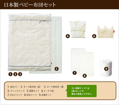 ●セット内容 (1)掛カバー/約90×120cm/綿100%(無添加ダブルガーゼ) (2)ヌード掛布団(厚)/約85×115cm/側地:ポリエステル100%、詰め物:ポリエステル100% (3)ヌード掛布団(薄)/約85×115cm/側地:ポリエステル100%、詰め物:ポリエステル100% (4)フィットシーツ/71×122cm/綿100%(無添加ダブルガーゼ) (5)固綿マット(敷布団)/70×120×2.5cm×2枚/側生地:ポリエステル100%、詰め物:ポリエステル100%(※2枚1セットで重ねて使用して下さい。