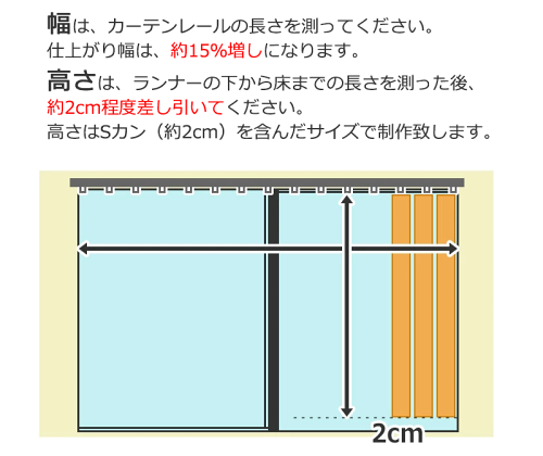 幅は、カーテンレールの長さを、高さは、カーテンレールのランナーの下から床までを測り、約2cmほど引いてください。